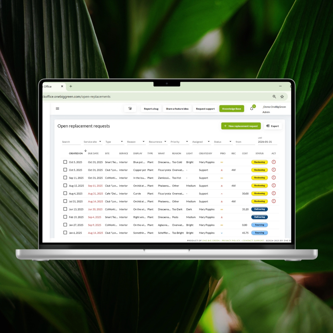 With One Big Green’s plant replacement and rotation management tools, your seasonal and color program schedules practically run themselves. The platform automates everything - from identifying what needs replacing to tracking orders, budgets, and visual confirmations - giving you total control over every refresh.